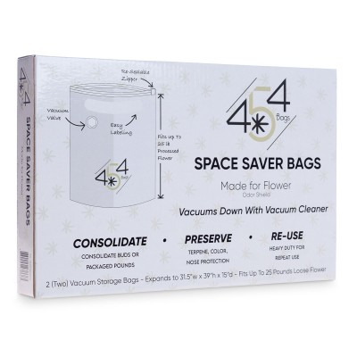 454 Bags’ Space Saver bags are a simple and easy way to vacuum seal large quantities of products with a regular vacuum cleaner for preservation or consolidation. You can place the flower directly into the bag or you can use it to store filled turkey bags, adding a vacuum protection.