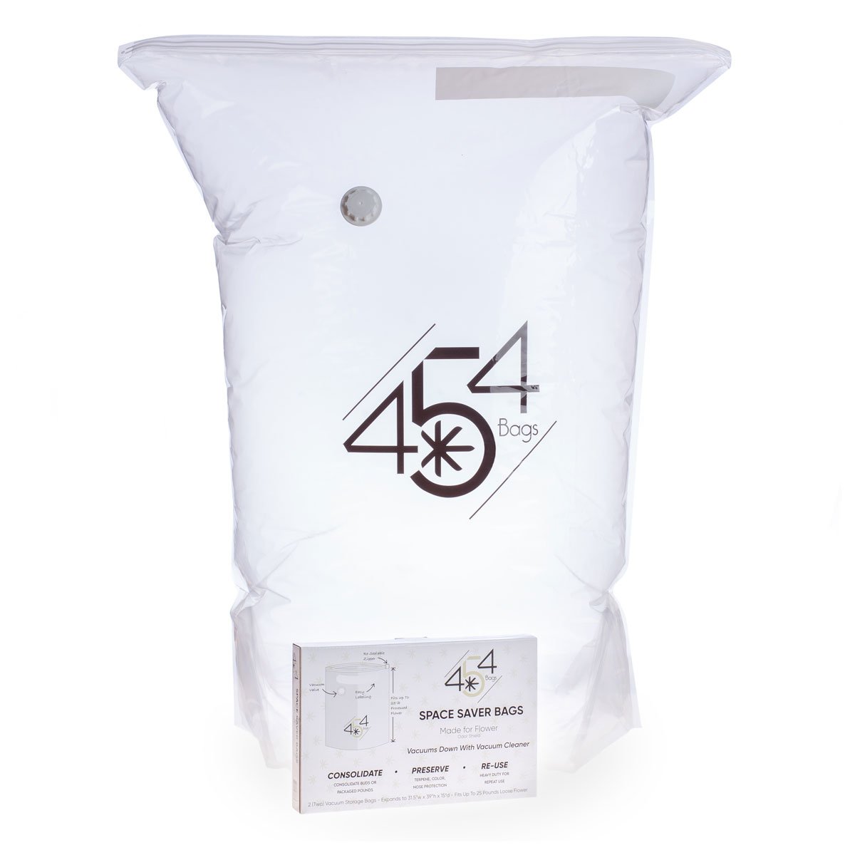 454 Bags’ Space Saver bags are a simple and easy way to vacuum seal large quantities of products with a regular vacuum cleaner for preservation or consolidation. You can place the flower directly into the bag or you can use it to store filled turkey bags, adding a vacuum protection.