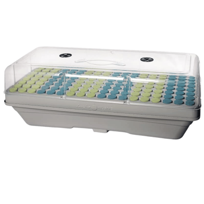 Become a propagation expert and grow a variety of new plants with TurboKIone Elite 144 High Quality Aeroponic Cloning System. Wow your friends with impressive growing skills thanks to this high-performance self-cooling cloning system. Pump fresh, cool air into the reservoir and cooling chambers with 4,800 RPM of air for more oxygen, cooler temperatures, and faster rooting. The reinforced basin prevents bowing and spilling so you can conveniently transport your cloning system worry-free. Interior temperatures stay chilled and efficient with a light grey coating to reflect light and heat. Easily keep track of clones using an alphanumeric grid system with green and blue clone collars, allowing you to separate plant varieties by color and notate positioning. Avoid dry clones, browning leaves, and burning with the high-quality dome that traps humidity and features adjustable ventilation. Achieve optimal growing conditions with TurboKIone Elite 144 Aeroponic Cloning System with Humidity Dome.